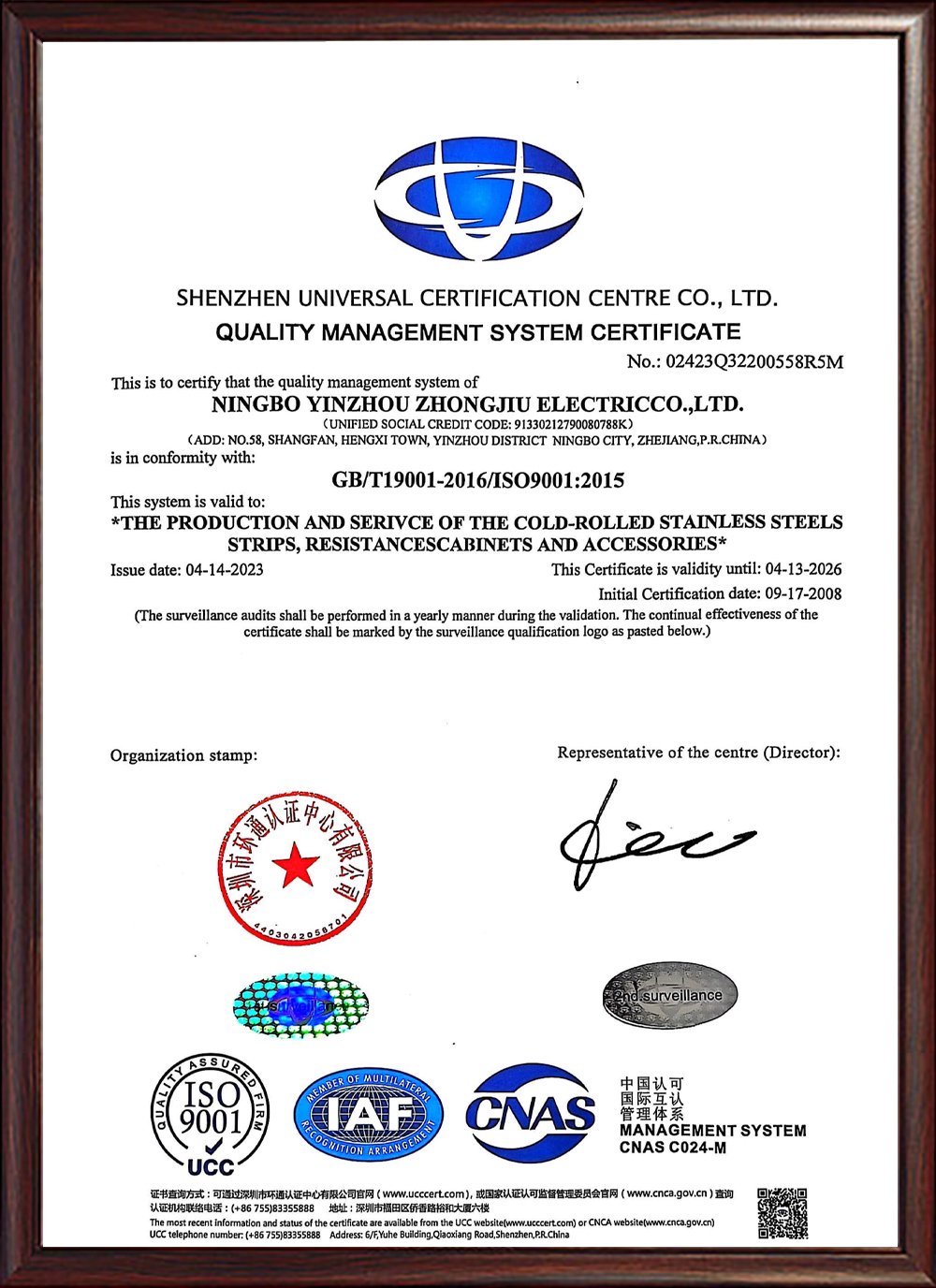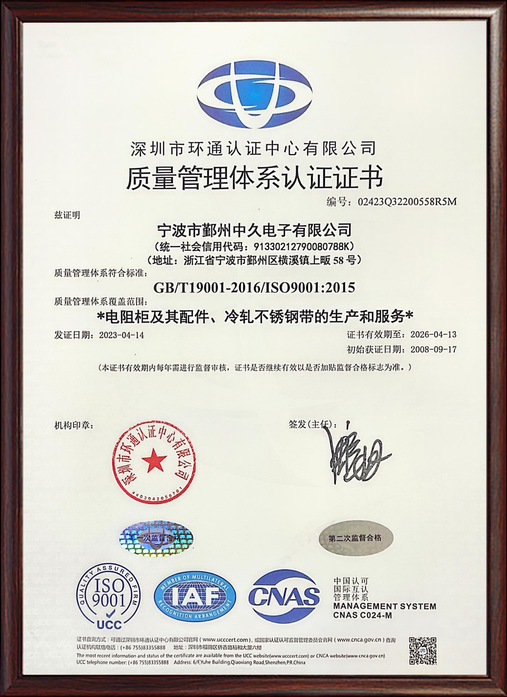 ISO質量管理體系認證證書